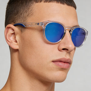 • Marco de Propionato Blanco Transparente con lentes Multicapa Azules - Presenta una estética moderna y dinámica que destaca.