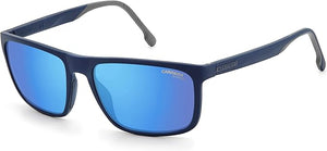 Las gafas de sol Carrera CA8047/S PJP XT presentan una audaz silueta rectangular con un marco azul vibrante y llamativos lentes de espejo gris azulado.