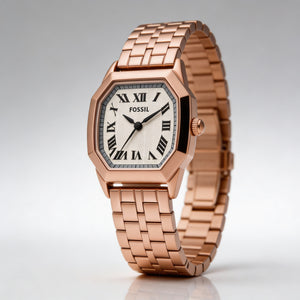 Adopte la elegancia atemporal con el Fossil Harlow, un reloj diseñado para adornar su muñeca con elegante sofisticación. Su radiante brazalete de acero inoxidable en tono oro rosa y su delicada esfera color crema ofrecen un toque de encanto refinado para cualquier ocasión.