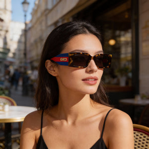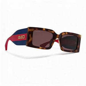 Sumérgete en tu poder con las icónicas gafas de sol Gucci Classic para mujer, diseñadas para destacar dondequiera que vayas. La impactante montura Havana, con detalles en rojo y azul intensos, complementa a la perfección las lentes multicolor para un look inolvidable.
