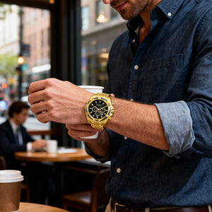 • Haga una declaración poderosa con la robusta caja de 50 mm en tono dorado, diseñada para destacarse en cualquier muñeca.