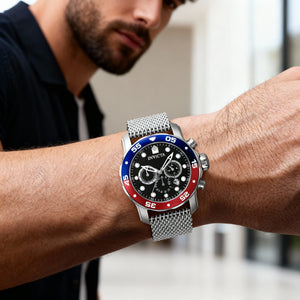 • Diseño audaz de acero inoxidable en tono plateado de 48 mm: cuenta con un bisel unidireccional dinámico azul, rojo y negro y una cómoda correa de malla para una apariencia impactante y segura.
