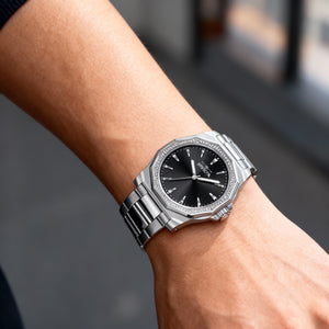 • Muestre un estilo atemporal con una caja de acero inoxidable en tono plateado de 42 mm complementada por una versátil esfera negra.