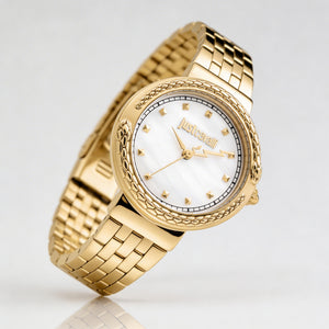 Reloj de pulsera para mujer Just Cavalli, con acabado en tono dorado y construcción resistente a los golpes.