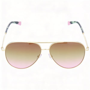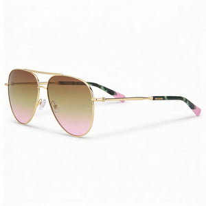 Brilla con las gafas de aviador M Missoni, diseñadas para infundir en tu look un toque de glamurosa sofisticación. Estas impresionantes monturas doradas, acentuadas con lentes degradados grises y rosas, prometen tanto un estilo impecable como la esencial protección 100% UV para tus ojos.