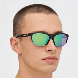 • Make a contemporary statement with the stylish Matte Black frame and striking Green Mirror lenses.