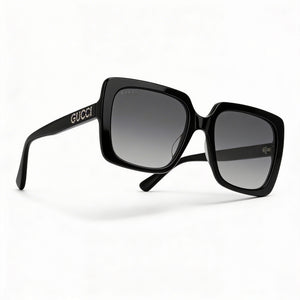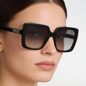 • Embrace your inner diva with these Gucci sunglasses, featuring an oversized square frame in a chic Black, Crystal, and Grey Gradient finish, complemented by signature crystal detailing at the temples for a truly glamorous look.