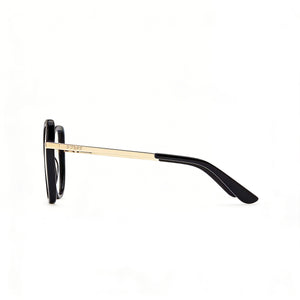 • Experience enduring fashion with a Shiny Black and Pale Gold plastic frame that blends classic appeal with a touch of modern elegance.