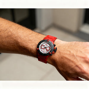 - **Striking 50mm Red & Black Design with Transparent Dial** - Command attention and express your unique style with a bold, oversized case and an eye-catching transparent aesthetic.