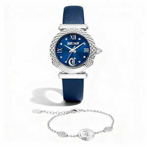 Just Cavalli Fashion Women's Round Silver Stainless Steel Case Midnight Blue Leather Quartz Watch 30mm Mineral Glass