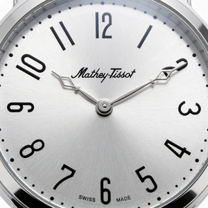 Experience timeless sophistication on your wrist with this Mathey-Tissot men's watch. Its classic white dial and elegant leather strap are perfectly complemented by water-resistant reliability, making it an essential accessory for the discerning gentleman.