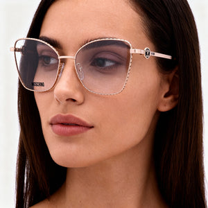 Embrace your inner fashion icon with these stunning Moschino Modern eyeglasses, radiating warmth and luxury in a captivating Gold Copper hue. Designed for the woman who dares to shine, their graceful butterfly shape and radiant metal frame perfectly frame a look of unparalleled confidence.
