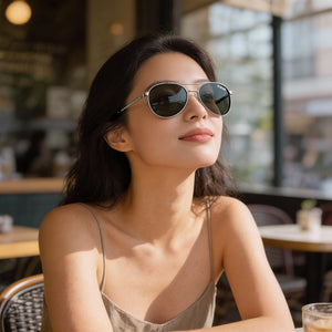- Elevate your look with the classic Pilot shape, featuring a daring double bridge and sophisticated Ruthenium-hued metal frame, perfect for completing any outfit.