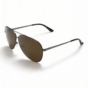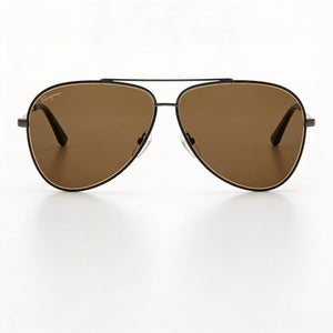 • Elevate your look with the sophisticated pilot style of these Salvatore Ferragamo sunglasses, featuring a striking Gunmetal and Dark Brown metal frame.