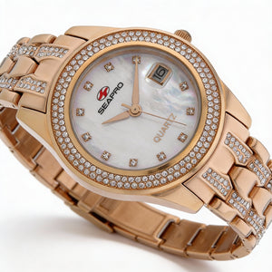 Elevate your everyday style with the Seapro Women's bracelet watch, a truly captivating accessory designed to sparkle. Adorned with shimmering crystals on the bezel, markers, and bracelet, alongside a beautiful Mother of Pearl dial, this timepiece is a radiant expression of elegance.