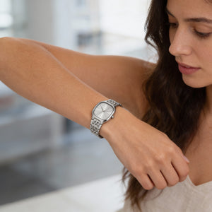 - Sophisticated Silver Design - Make a distinctive statement with the refined soft-square 28mm silver stainless steel case and elegant silver sunray dial.