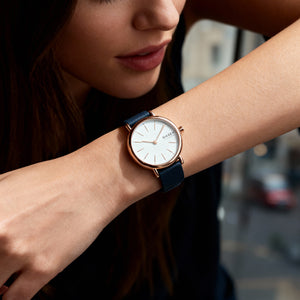 Discover the understated elegance of Danish design with the Signatur Lille, where the warmth of rose gold beautifully complements a serene blue leather strap. Crafted for the modern woman, its refined profile and clear dial offer sophisticated style and comfortable precision for every moment.