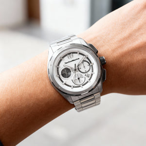 • Command attention with a 43mm silver-toned stainless steel case and a silver dial, offering a timeless aesthetic that effortlessly complements any attire.