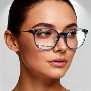 Empower your gaze and elevate your everyday with Under Armour's Women's rectangular optical frames in a stunning Blue Crystal. Experience the perfect fusion of enduring comfort and sleek design, meticulously crafted from premium acetate to complement your active lifestyle.