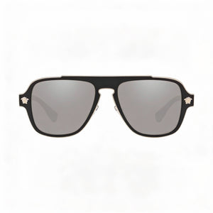 • Elevate your look with authentic Versace sunglasses, featuring a unique irregular frame shape and a sophisticated Black and Dark Grey composite frame.